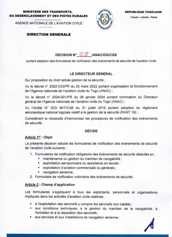 - 2026-02-CGS-DECISION N°08-PORTANT ADOPTION DES FORMUANIRES DE NOTIFICATION DES EVENEMTS DE SECURITE 1 DECISION N° 08 IANAC/DG/CGS portant adoption des formulaires de notification des événements de sécurité de l’aviation civile